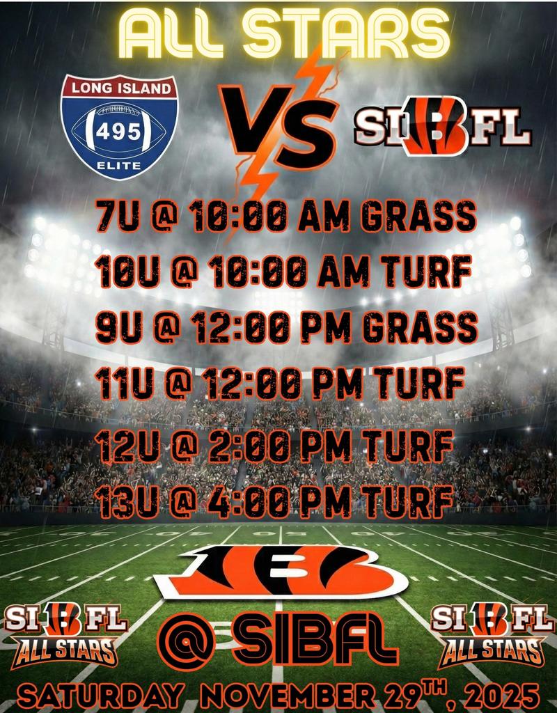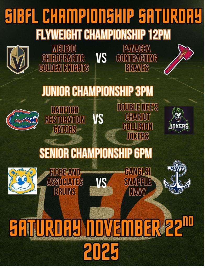 The Fall 2025 SIBFL Senior Championship kicks off on Saturday November 22nd, 2025 at 6PM at SIBFL.